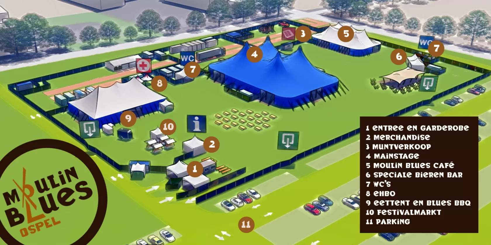 Every year, we transform a meadow in the Ospel countryside into an atmospheric festival ground. You’ll find two stages housed in large festival tents, a food tent, and a lively festival market. There are also facilities such as a staffed cloakroom, a first aid post, and an information stand offering the latest Moulin Blues merchandise. The tents are heated and equipped with wooden flooring for extra comfort and accessibility.